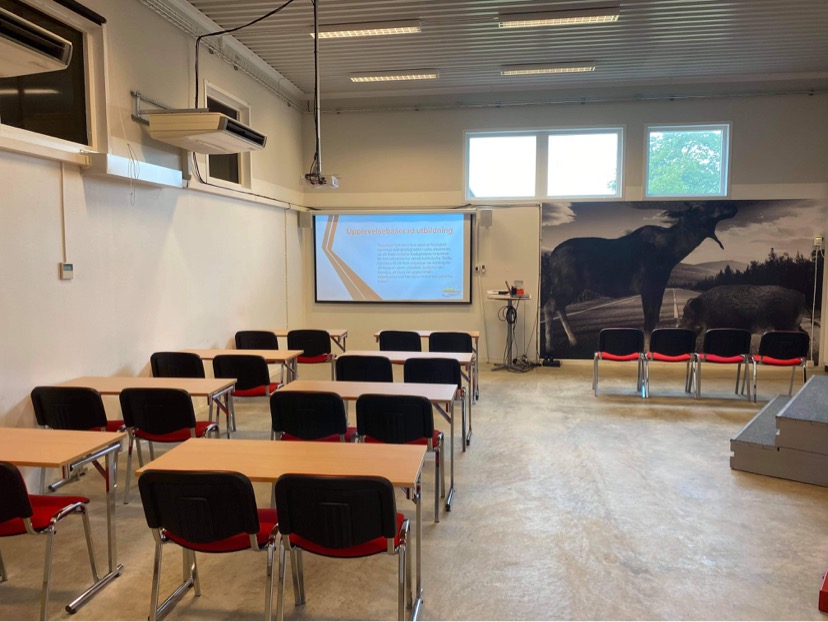 Vår utbildningslokal för teori med upplevelse- och säkerhetshall är modern för upp till 24 deltagare och utrustad med vältbil, krocksläde och krockvåg.